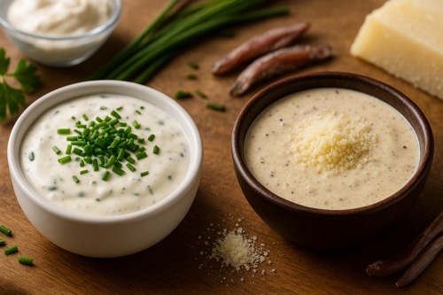 랜치소스와 시저드레싱은 모두 크리미한 질감을 가지고 있지만, 재료의 구성과 맛의 뉘앙스에서 확연히 다릅니다. 랜치는 상큼·고소·범용성, 시저는 진한 치즈와 감칠맛으로 요리에 개성을 더합니다.