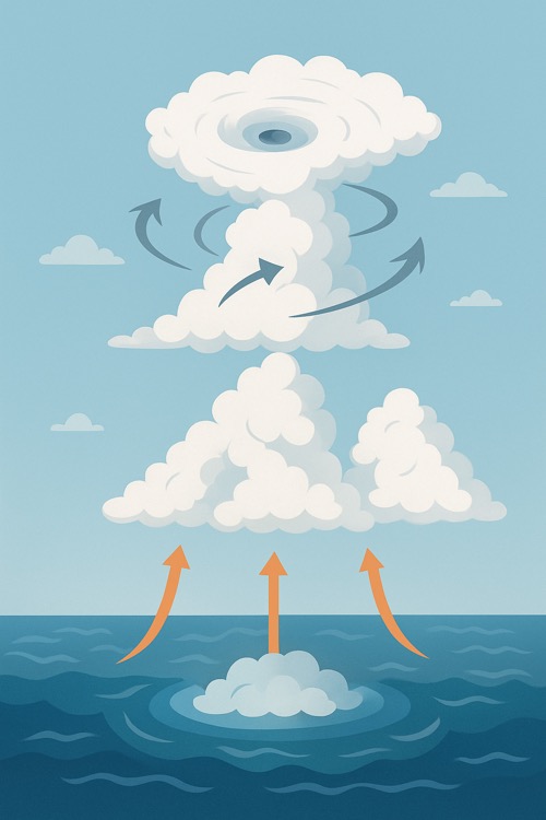수증기가 응결하며 방출하는 잠열(heat energy) 이 다시 대기를 가열해 상승 기류를 더욱 강하게 만듭니다.