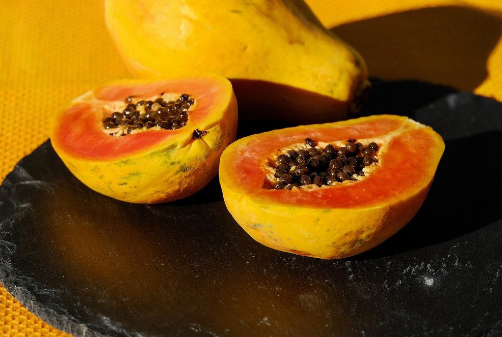 파파야는 천연 소화 효소인 파파인을 포함하고 있어 단백질 소화를 돕습니다. 파파야는 소화 과정을 원활하게 하고, 위의 산도 균형을 맞추는 데 도움을 줍니다. 신선한 파파야를 섭취하거나 주스로 만들어 마실 수 있습니다.