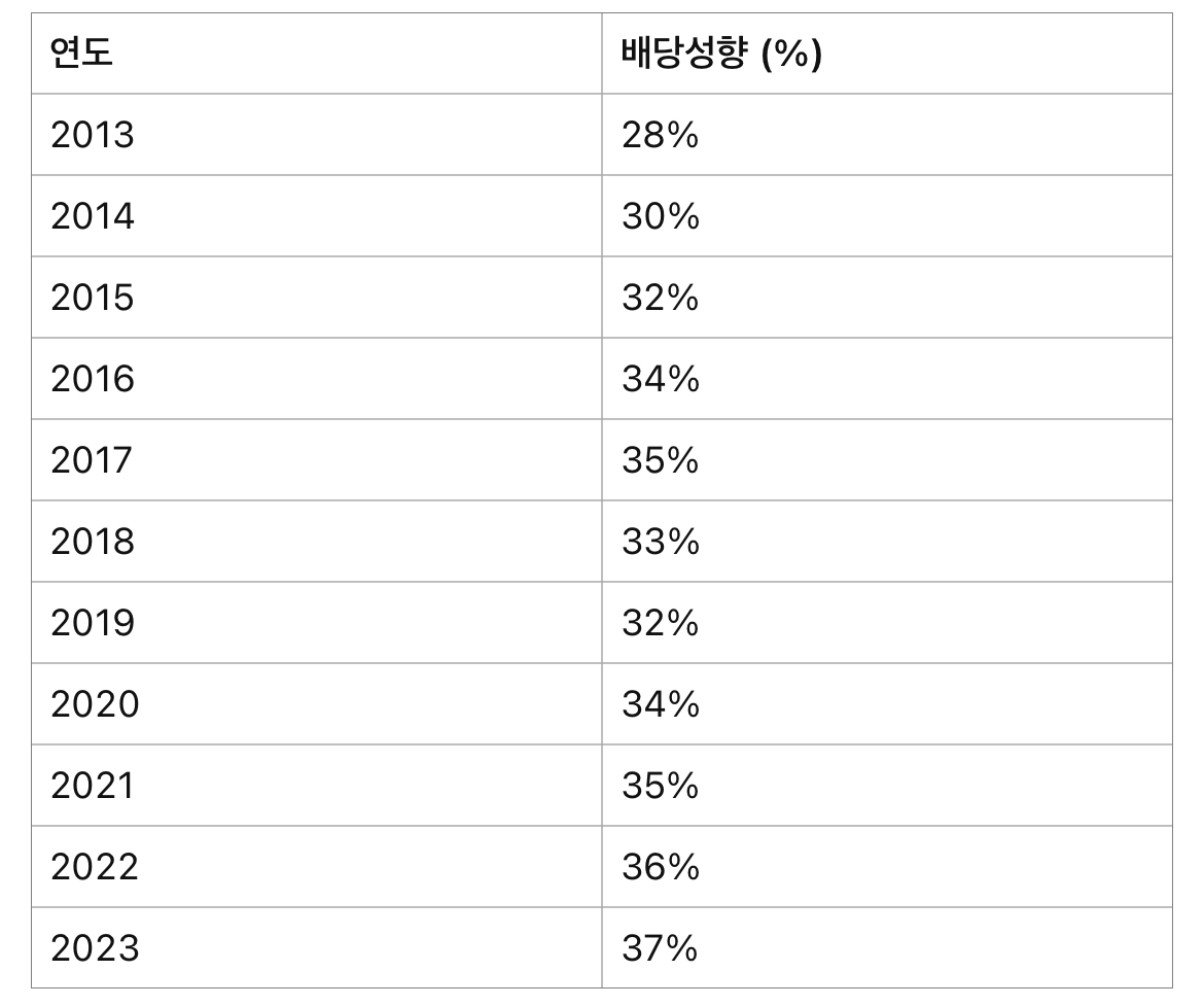 배당성향은 회사의 순이익 중 얼마나 많은 부분을 배당금으로 지급했는지를 나타내는 지표입니다. 코스트코는 지난 10년간 안정적인 배당성향을 유지해왔습니다. 평균 배당성향은 약 30-35% 사이로, 이는 코스트코가 배당 지급 외에도 재투자를 통해 성장을 지속하고 있음을 의미합니다.