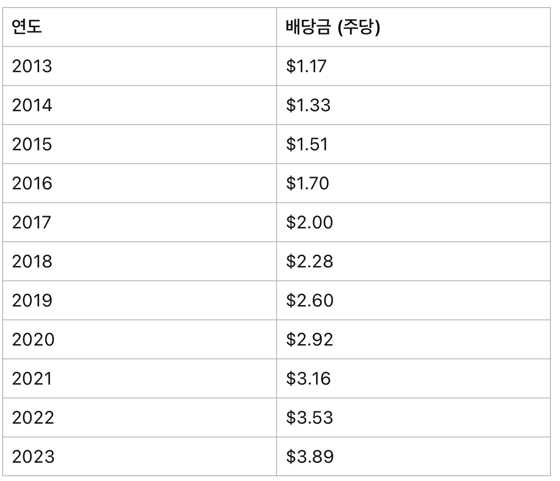 코스트코는 지난 10년 동안 꾸준히 배당금을 지급해 왔습니다. 아래는 연도별 배당금 지급 내역입니다.