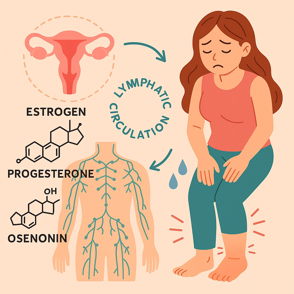 생리 전에는 호르몬 변화로 근육 긴장도와 혈관 탄성이 떨어지고, 림프관 수축이 둔화됩니다. 이로 인해 하체나 얼굴, 손 같은 말단 부위에서 림프 정체가 발생하며 ‘붓는다’는 느낌이 커집니다.