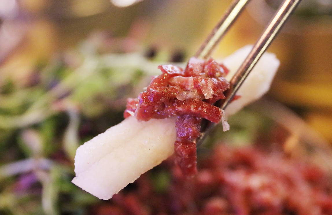 채끝살은 등심 부위와 연결된 부위로, 고기의 결이 곱고 육즙이 풍부한 것이 특징입니다. 지방이 적당히 있어 육회의 맛을 한층 더 고소하고 깊게 만들어 줍니다. 특히 채끝살은 고기의 결이 살아 있어 씹는 맛과 부드러운 맛을 동시에 즐길 수 있는 장점이 있습니다.