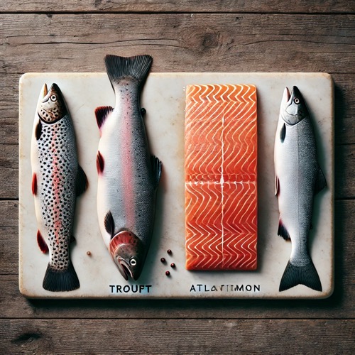 외형 면에서 연어는 더 크고 육중하며, 등 부분은 푸르스름한 색을 띠고 있습니다. 송어는 연어보다 다소 작고 납작한 체형을 가지며, 몸 전체에 고르게 분포된 작은 검은 반점이 특징입니다. 살색은 두 생선 모두 선명한 주황색 또는 붉은빛을 띠지만, 송어는 연어보다 약간 더 선홍빛에 가깝고, 섬세한 결을 보입니다.