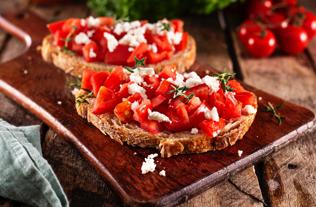 토마토, 바질, 올리브 오일을 곁들인 브루스케타는 레드와인의 상큼한 맛과 잘 어울립니다.