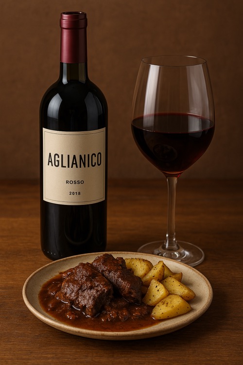 알리아니코는 장시간 끓인 붉은 육류 스튜, 예를 들어 토마토 베이스의 브라치올레, 오소부코 등과 찰떡궁합입니다. 음식의 감칠맛과 와인의 산도가 입안에서 복합적인 하모니를 만들어냅니다.