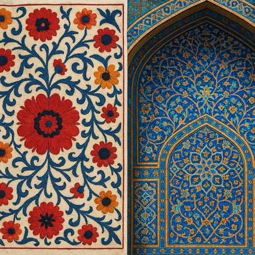 실크로드를 따라 걷다 보면, 눈을 사로잡는 무늬들이 있습니다. 화려하면서도 절제된, 반복되지만 결코 단조롭지 않은, 그 문양들은 중앙아시아 문화의 깊은 심장을 보여줍니다. 이번 글에서는 중앙아시아의 대표적 전통 문양인 ‘수잔니(Suzani)’와 모자이크 타일에 담긴 이야기를 통해 이 지역 사람들이 삶과 신앙, 자연을 어떻게 표현해 왔는지 살펴보겠습니다.