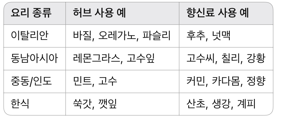 바질의 달콤함, 타임의 솔잎 향, 민트의 청량함이 대표적입니다.