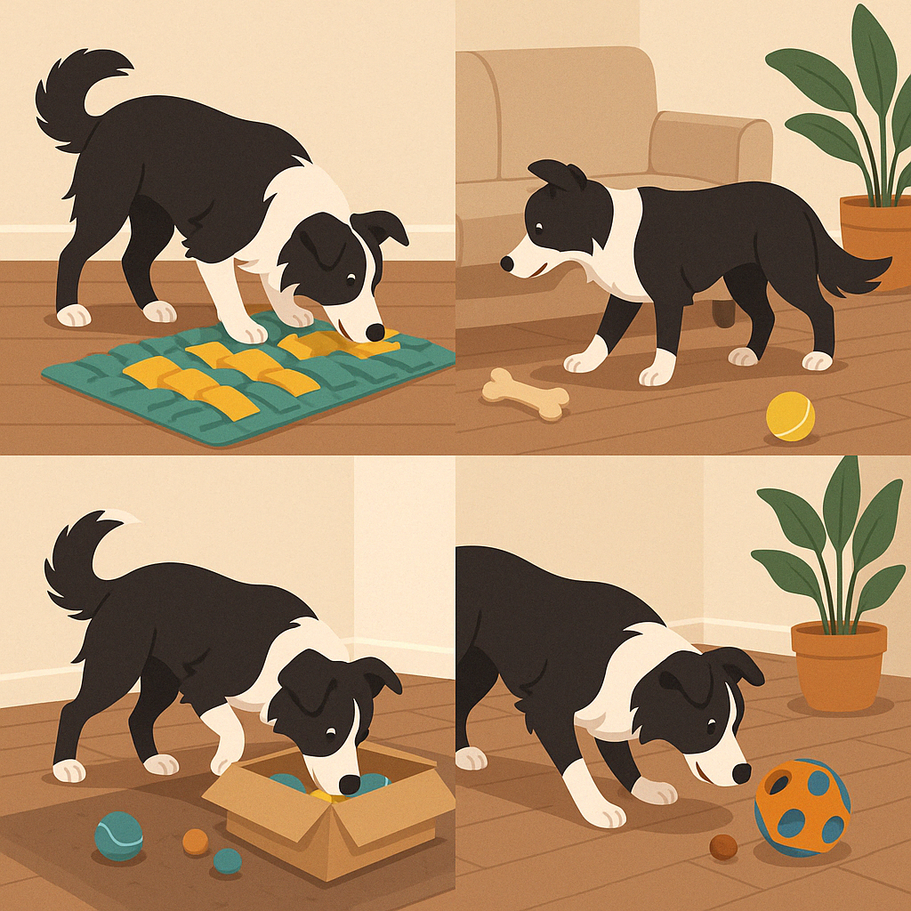 보더콜리는 후각도 예민한 편이라 노즈워크는 최고의 실내 놀이 중 하나입니다. 노즈워크 매트나 수건에 간식을 숨겨두면, 강아지가 냄새를 추적하며 찾아내는 놀이가 됩니다.