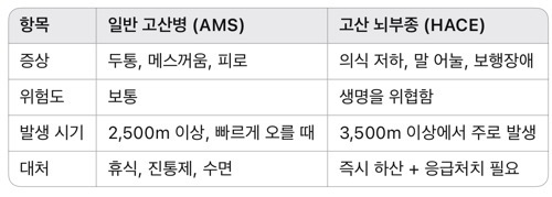 • 고산에 대한 개인의 민감성 (체력과 무관하게 발생 가능)