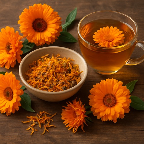 메리골드 차는 은은한 풀내음과 함께 가벼운 단맛, 그리고 끝에 약간의 쌉싸름함이 남는 것이 특징입니다. 시각적으로는 선명한 황금빛을 띠며, 꽃잎이 물에서 천천히 퍼지는 모습이 인상적입니다.