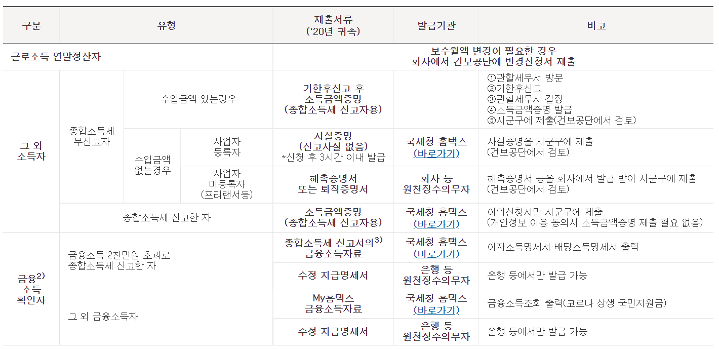 소득금액으로 인한 이의 신청일 경우, 소득금액을 증명할 수 있는 서류를 함께 제출하여야 합니다. 대부분의 제출 서류는 홈택스에서 본인인증 로그인을 통해 온라인으로 발급 가능합니다. 단 종합소득세를 서면으로 신고한 경우에는 가까운 세무서를 방문해서 조회 가능합니다.