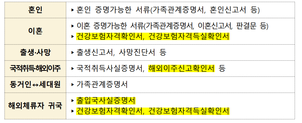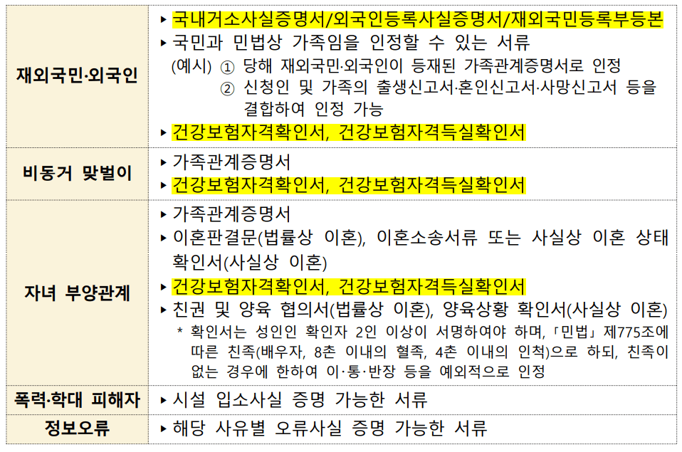 이 중 노란색으로 표시된 서류는, 신청인이 행정정보 공동이용에 동의하는 경우, 별도 제출하지 않아도 됩니다.