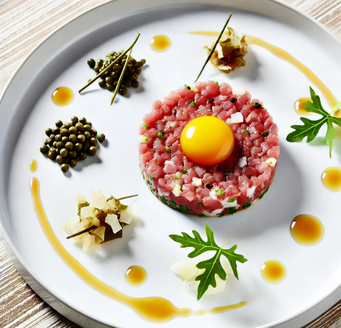 스테이크 타르타르는 신선한 소고기를 매우 곱게 다져서 여러 재료와 함께 섞어 먹는 요리입니다. 고기에는 주로 다진 양파, 피클, 케이퍼, 머스타드, 그리고 계란 노른자 등이 첨가됩니다. 이때 생고기는 매우 신선해야 하며, 보통 양념을 통해 고기의 풍미를 돋우고 감칠맛을 극대화합니다.