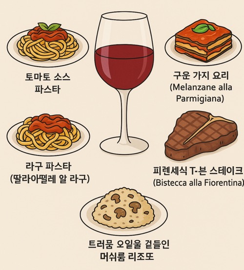 추천 와인: Chianti Riserva, Super Tuscan (산조베제 기반)