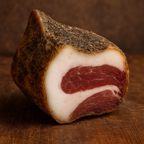 ‘구안찰레(Guanciale)’는 이탈리아어로 ‘볼(guancia)’에서 유래한 말로, 돼지의 볼살(혹은 목덜미살) 부위를 소금, 후추, 로즈마리, 마늘 등으로 간을 한 후 수주~수개월간 건조 숙성한 전통 육가공품입니다. 지방 함량이 높고 풍미가 진하며, 익히면 지방이 녹아내려 요리에 깊은 맛을 더하는 것이 특징입니다.