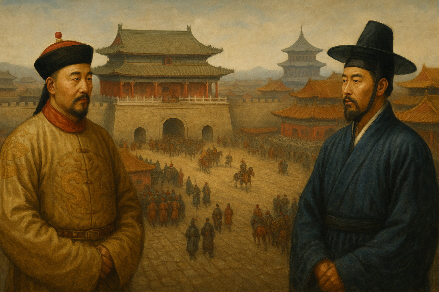병자호란 당시 조선의 인조가 남한산성에서 항복한 이후, 청 태종(홍타이지)은 조선 왕실의 세자(봉림대군)와 대군(소현세자)를 인질로 심양으로 데려갑니다. 이 사건은 조선 조정과 민중에게 엄청난 충격이었고, ‘삼전도의 굴욕’으로 역사에 기록됩니다.